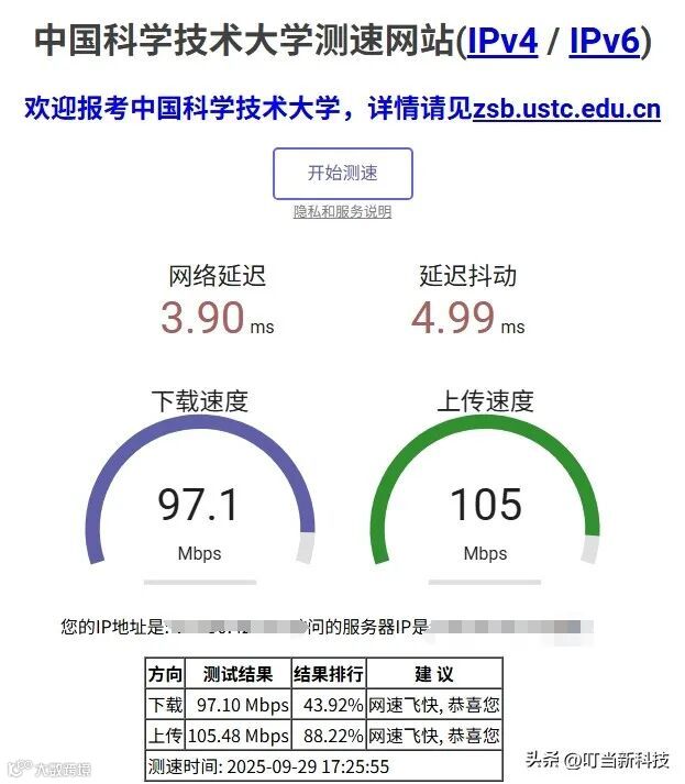 例如叮当的刚刚测试了自己的100Mbps光纤,下载速度为97.1Mbps,上传速度为105Mbps,网络延迟3.90ms,延迟抖动4.99ms。换算一下,下载速度约为12MB/s,上传速度为13MB/s,符合正常数值。