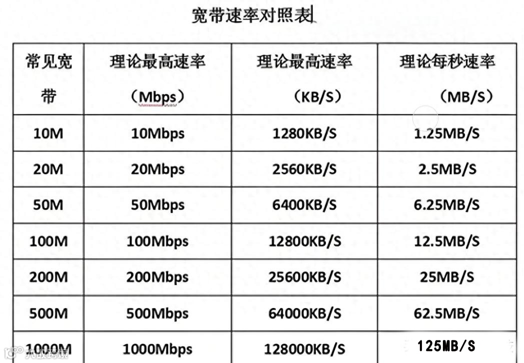 拿叮当所在地中国电信宽带为例,目前速度最快的是电信1000Mbps千兆光纤宽带,这里的1000Mbps是IEEE 802.3标准规定千兆以太网理论传输速率,实际可用速率可能在900-940Mbps之间,按照换算公式1000Mbps÷8=125MB,其实最高的理论下载速度只有125MB/s。