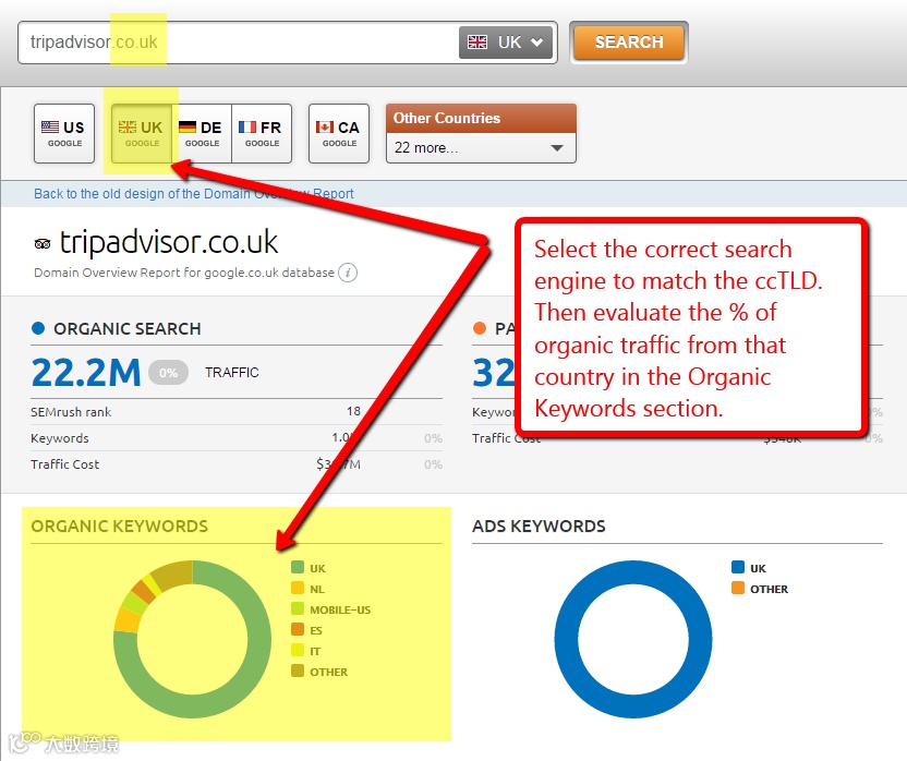 首先,我评估了ccTLD。我研究了三个品牌,它们使用单独的国家编码顶级域名来定位其国际受众。使用Semrush的域概述报告(Domain Overview Report)很容易做到这一点。只需输入一个域名,然后选择相关国家的搜索引擎。例如,对于tripadvisor.co.uk这个网站,选择UK Google作为搜索引擎。