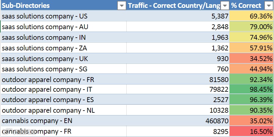 这张图表证实了我的假设,即ccTLD具有最高的准确度,其次是子目录和子域名。然而,需要注意的是我的样本量很小(只有8个品牌和30个网站)。其他因素,例如Hreflang执行等等也会影响准确率。我也不能访问所有这些域名的Webmaster Tools,以查看Google Search Console中的地理定位是否正确也是一个因素。但是,这确实证实了我的猜测,我希望其他人能够补充这个数据集。