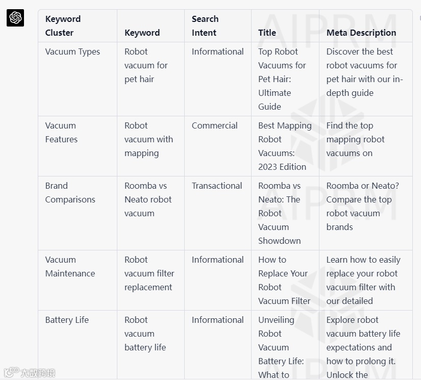 如果你现在需要进行扫地机器人相关的关键词调研,你可以考虑使用AIPRM扩展中的"keyword strategy" prompt来快速获得结果。输入种子关键词如"robot vacuum"后,ChatGPT将会生成Keyword Cluster、Keyword Search Intent、Title、Meta Description五列相关内容,大大减轻了手动分类及撰写标题与描述的工作负担。相较于传统的关键词拓展方式,使用prompt的方式可以更高效地生成相关的内容。