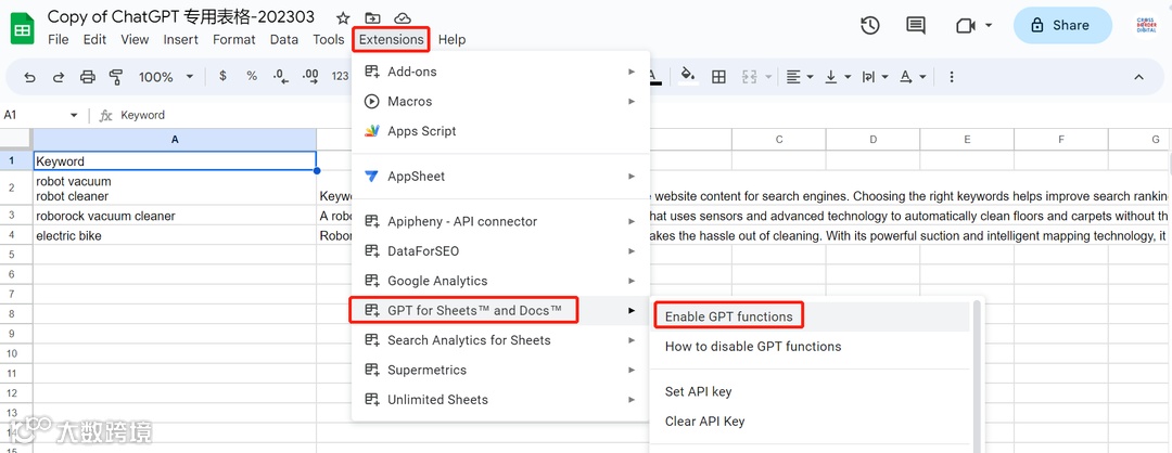 7.复制API key之后点击扩展程序,然后选择GPT for Sheets and Docs,点击激活。(Extensions > GPT for Sheets and Docs > Enable GPT functions)