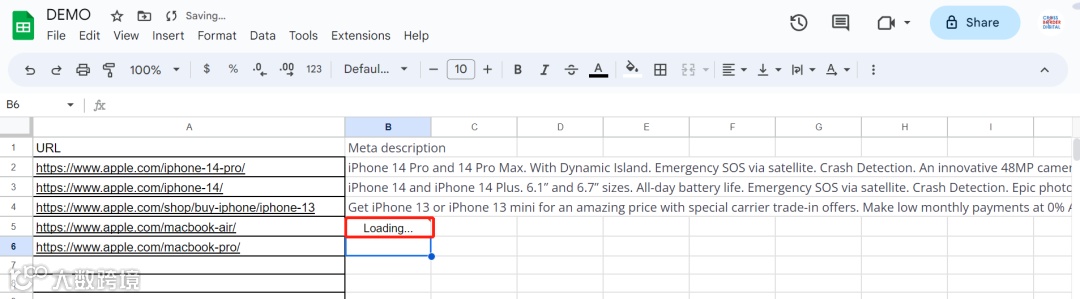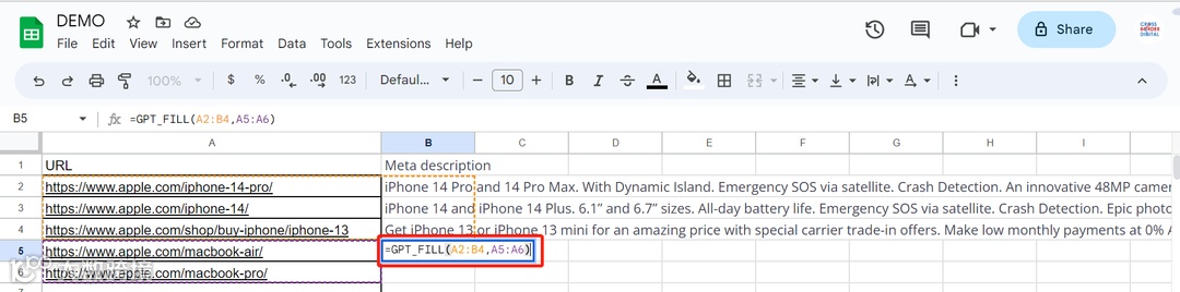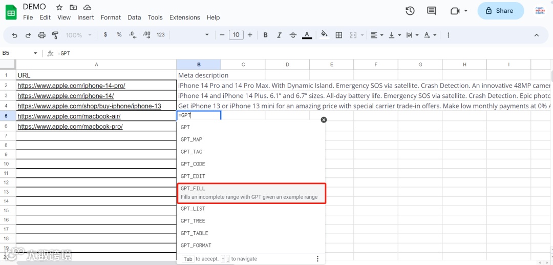 下面我们将以Apple官网为例,介绍这个扩展的用法。该扩展提供了一系列命令,类似于Excel中的函数,例如,如果你需要为新的URL生成meta description,你需要在第一个单元格中输入“=GPT”,然后选择GPT_FILL函数。该函数可以按照给定区域的数据来填充剩余的区域。在此示例中,给定区域为A2:B4单元格的数据。现在,你需要使用该函数来填充A5:A6单元格区域对应的meta description。