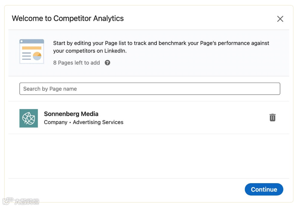 具体步骤如下:访问公司主页——打开分析菜单(Analytics menu)——选择竞争对手(Competitors)。如果你是第一次使用该工具,请输入竞争对手的名称,点击继续,建立你的名单,或点击"编辑竞争对手"来完善你的名单。名单最多可添加九名竞争对手的主页。