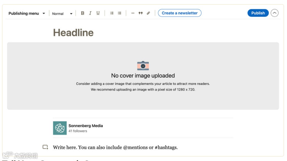 另一种方式是发布领英文章,字符数量允许超过100,000个。领英文章可添加媒体、提及(@)和外部链接,让你分享更深入的见解,发挥思想领袖的作用。