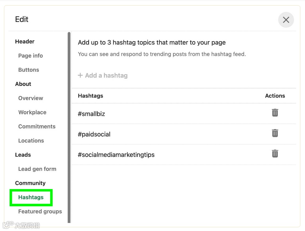 公司主页可添加最多三个标签。具体步骤如下:访问公司主页——点击“编辑页面”(Edit Page)——点击"标签"(Hashtags,最多添加三个关键词)。