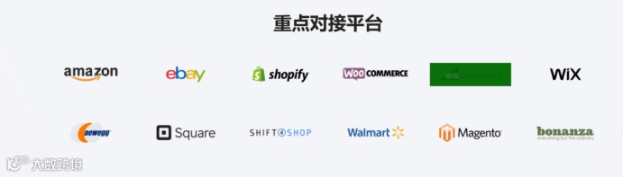 实现主流跨境综合类电商平台对接,如Amazon、eBay、Wish、Newegg等;垂直类电商平台,如Wayfair、overstock、HomeDepot等;独立站平台,如Shopify、Wix、Shopline、Bigcommerce、Woocommerce等;