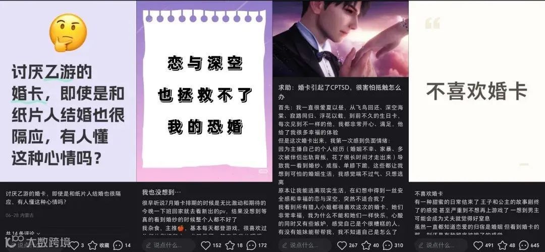 此外,婚卡的工业化生产模式也折射出国乙市场正从“增量竞争”转向“存量博弈”。早期市场依赖新用户增长,婚卡凭借精美卡面、深情剧情和氪金外观即可吸引大量玩家[7]。但如今核心用户群体趋于稳定,新玩家比例下降,审美疲劳日益显现。