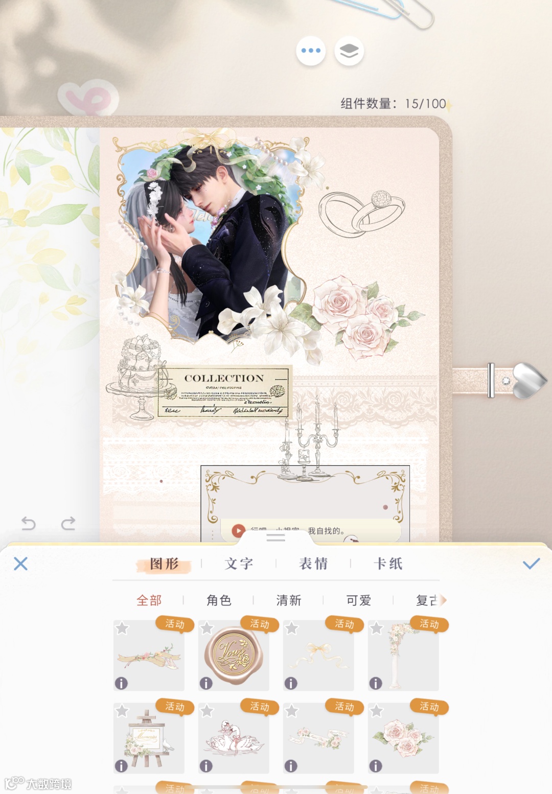 桌面「小组件」功能则让男主“跳出”游戏界面,增强玩家在日常生活中与角色的联结。而「手账」功能提供高自由度DIY玩法,玩家可将写真、大头贴、短信、语音等素材,通过模板、贴纸、印章等进行个性化装饰,提升情感沉浸体验