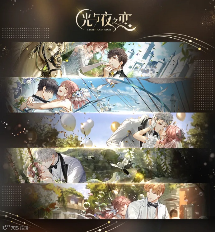 《光与夜之恋》在2022年一周年庆推出“繁花与序章”婚卡,并邀请高定婚纱设计师兰玉操刀服装设计;《未定事件簿》与《时空中的绘旅人》也相继推出中式或西式婚礼卡池,时间节点多集中于周年庆与情人节