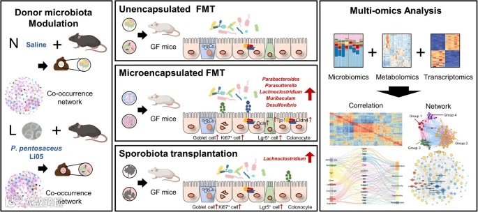 粪菌移植(FMT)已成为治疗多种疾病的有效手段。然而,FMT的疗效高度依赖供体菌群的质量以及递送过程。尽管“超级供体”的筛选备受关注,但如何主动且精确地调控供体微生物组以强化FMT效果,仍是一个关键挑战。本研究旨在制定改变供体肠道菌群的策略,以促进移植后无菌小鼠的胃肠道发育和成熟。采用益生菌戊糖片球菌Li05作为肠道菌群调节剂,建立更健康的供体粪便菌群,结合微胶囊法,确保胃肠道转化过程中细菌的高活力。