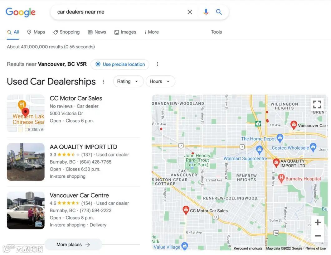 本地搜索引擎优化可以针对特定地点的用户推广你的网站。例如,用户在谷歌上查询"我家附近的汽车经销商",他们就是在进行一个特定地点的搜索查询。