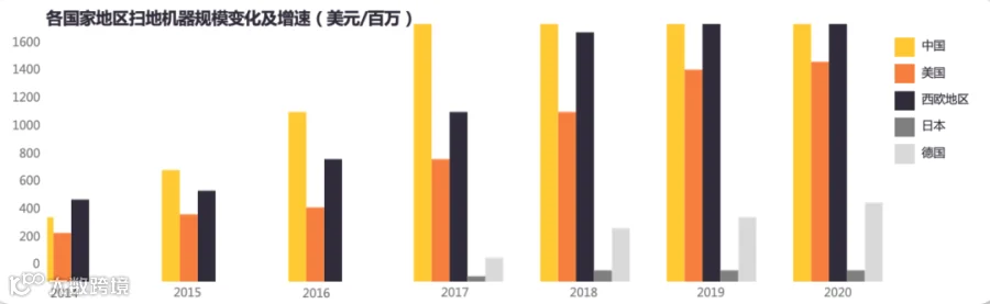 其中,西欧、中国和美国扫地机器人行业市场规模最大,2020年,西欧和中国均超12亿美元。