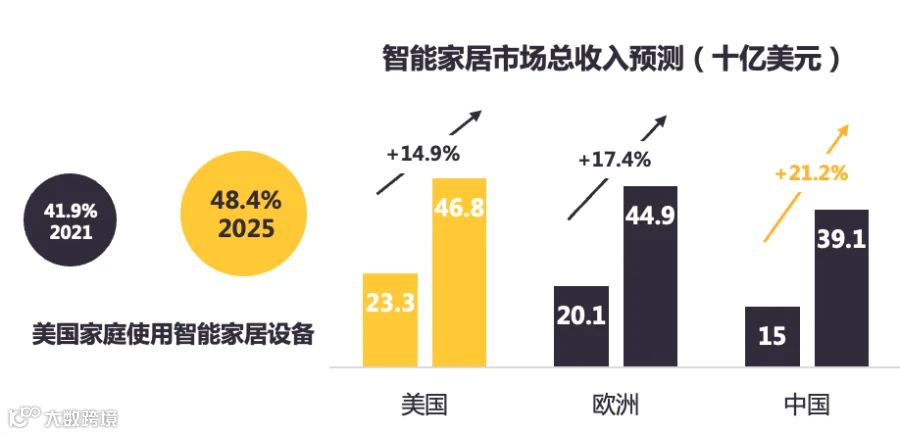 而在海外主要地区,美国则是智能家电最大的市场,2020年收入为233亿美元,预计年增长率为14.9%,到 2025 年,将带来468亿美元的收入。