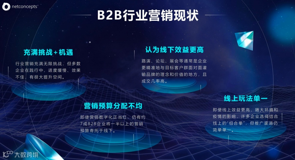 当下B2B行业营销充满着无限挑战,但多数企业在践行中,进度缓慢、效果不佳,有很大的提升空间。即使营销数字化正当红,仍有约7成B2B企业将一半以上的营销预算寄托于线下。同时,路演、论坛、展会等通常是企业更精准地与客户群面对面灌输品牌的理念和价值的地方,且成交率高,即便线上效益更高,随大环境和疫情的影响,许多企业选择结合线上的“组合拳”,但推广渠道仍然单一。