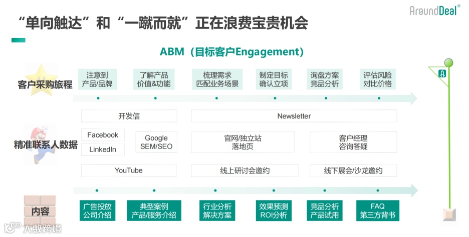 当下,B2B企业现状是线索询盘少、线索成本高、线索转化差,针对业绩目标和增长现状,如何在精准前提下扩大获客量?AroundDeal通过“穷举式”ABM获客。