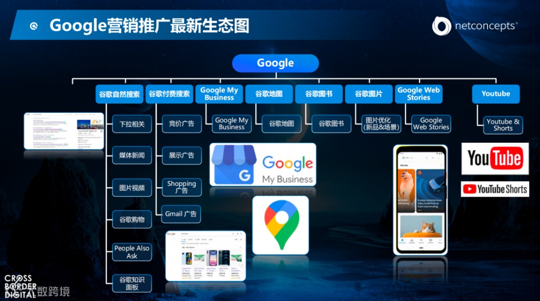 要聊B2B营销要聊搜索营销,不得不提Google的生态。Google的产品生态包括自然搜索(SEO)、付费广告(SEM)、Google My Business、地图、图书、图片、网页故事集和Youtube等。SEM广告是绝大多数企业会优先选择的推广渠道,以电商行业为例,推广费用中30%会花在search(关键词广告)上 ,60%花在PLA-product listing ads (购物广告), 10%花在展示广告(Display)上。
