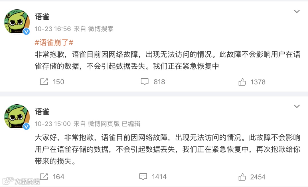 随后,“语雀崩了”登上话题热搜,有网友表示自己的公司项目文档都在语雀上,文档打不开严重影响工作进度;有网友将自己整理的面试题放在了语雀上,宕机时正好赶上电话面试,想查答案都无从下手;也有网友对语雀的运维提出质疑,认为“长时间的故障明显是存储出现了问题,用户数据可能丢失了,在紧急恢复”。