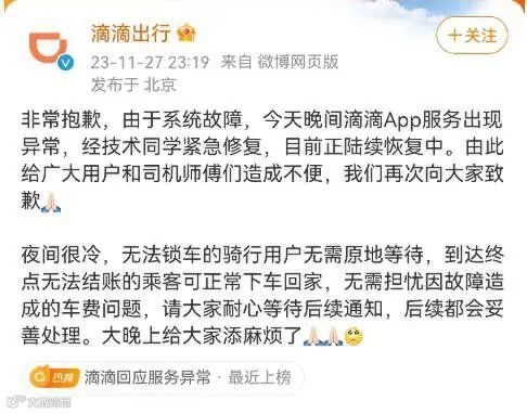 27 日深夜,滴滴出行对滴滴 App 服务出现异常进行了回复,滴滴出行称:非常抱歉,由于系统故障,今天晚间滴滴 App 服务出现异常,技术目前正陆续恢复中。由此给广大用户和司机师傅们造成不便,再次向大家致歉。