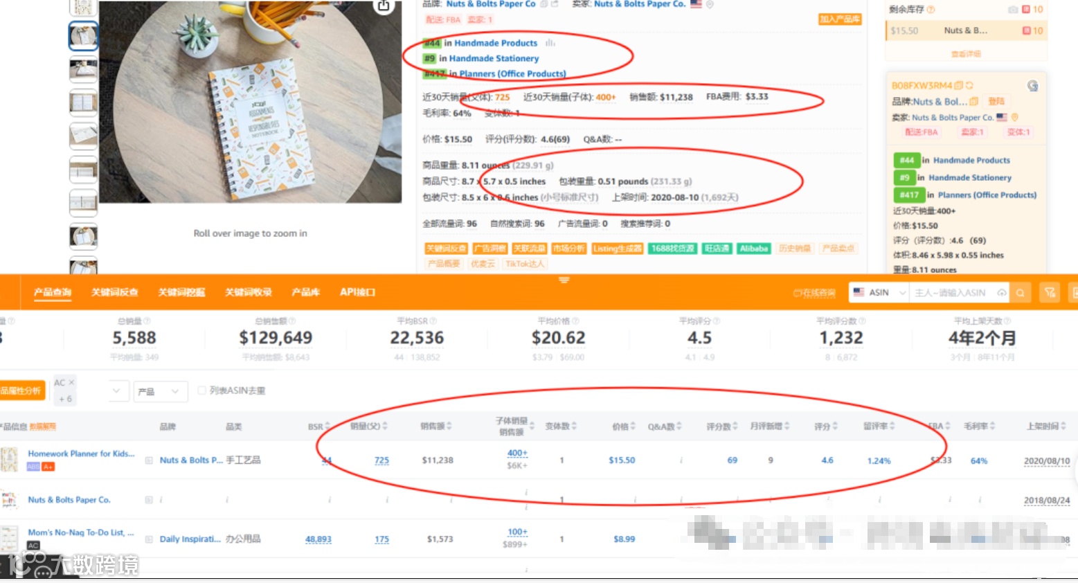 单量:在卖家精灵中显示上架时间是2020年08年10号,目前为止持续销售1692天,30天销售量725单,子体(400+)