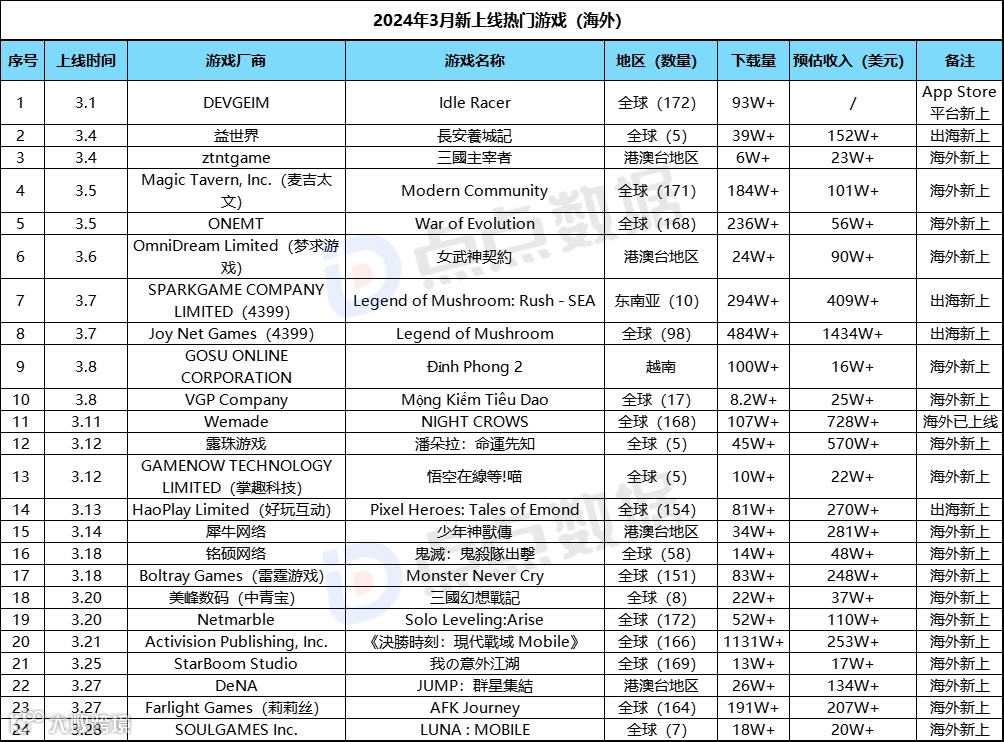 整体来看,三月海外多款新游流水破百万,多款国产出海产品也是取得了亮眼的成绩。从出海源头地区来看,东亚依旧是产出热门新游最为活跃的地区,其次为东南亚和北美。而从游戏类别上来看,以《Legend of Mushroom》(菇勇者传说)为代表的放置养成类手游风靡全球,是近半年以来最热门的题材,其次MMO、模拟经营也皆有爆款产出。题材上来看,经典IP加持下的受众基础仍然是流量和收入变现最为效率的选择,而传统的三国、魔幻乃至网红也不是没有出头之日。