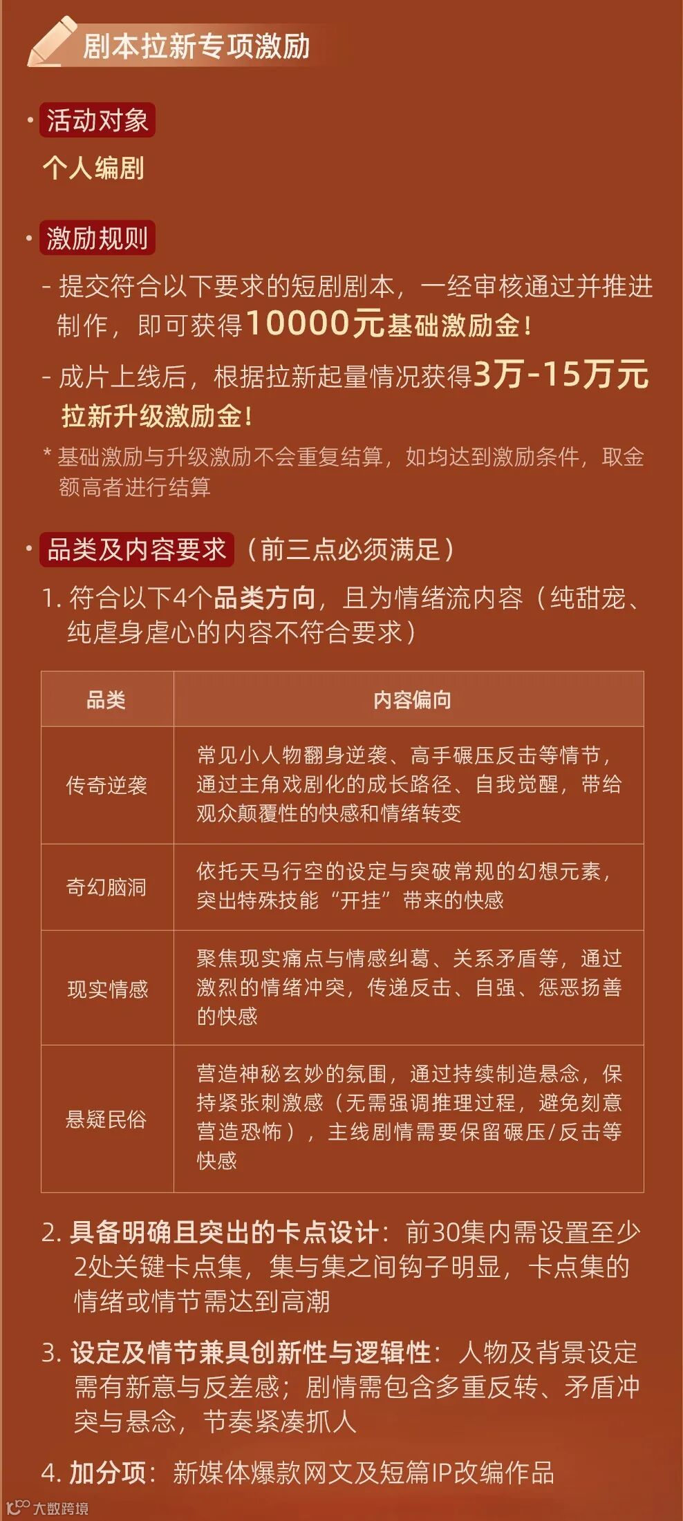 对于能更吸引、转化短剧用户的剧本内容,我们会给予专项激励。该条政策面向个人编剧,对原有的拉新向剧本激励进行了升级。