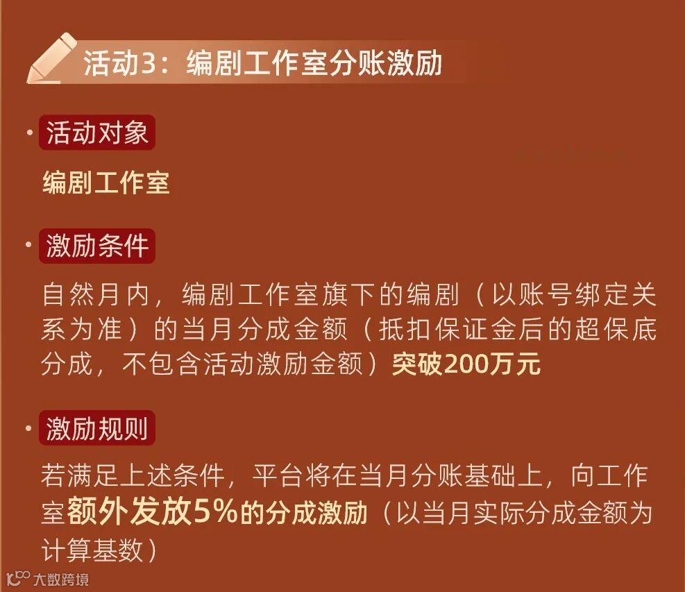 工作室旗下绑定的编剧当月的总分成金额突破200万时,工作室将享受额外的5%分成激励。