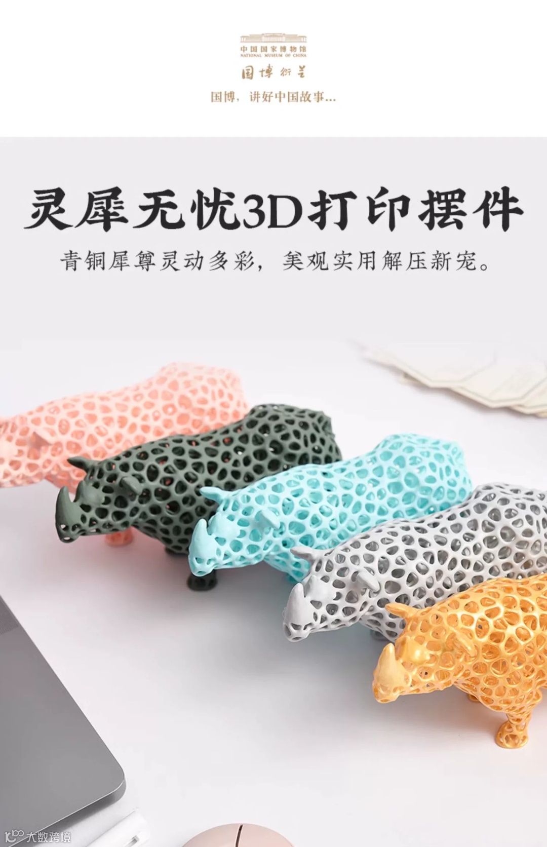 【灵犀无忧】解压牛,是国博继【灵犀自在】工艺摆件之后推出的一款功能性文创产品。该产品以犀尊形制为原型,利用参数化建模设计与弹性高分子材料3D打印而成,既传承了犀尊灵动的造型之美,又赋以软弹解压、绚丽多彩的产品表现,增强了文创产品的趣味性和实用性,老少咸宜、爱不释手,更是被广大观众解锁了多重玩法。