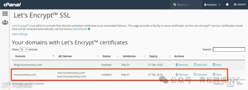 验证安装是否成功,可返回Let’s Encrypt SSL首页查看已安装证书列表: