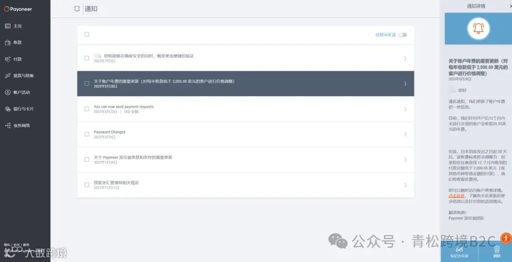 自2023年6月29日起,Payoneer将对在任意连续12个月内收款总额低于2000美元(或等值货币)的账户收取29.95美元的账户年费。该费用适用于所有注册账户,且不包含实体预付卡相关费用,仅为虚拟账户维护费。