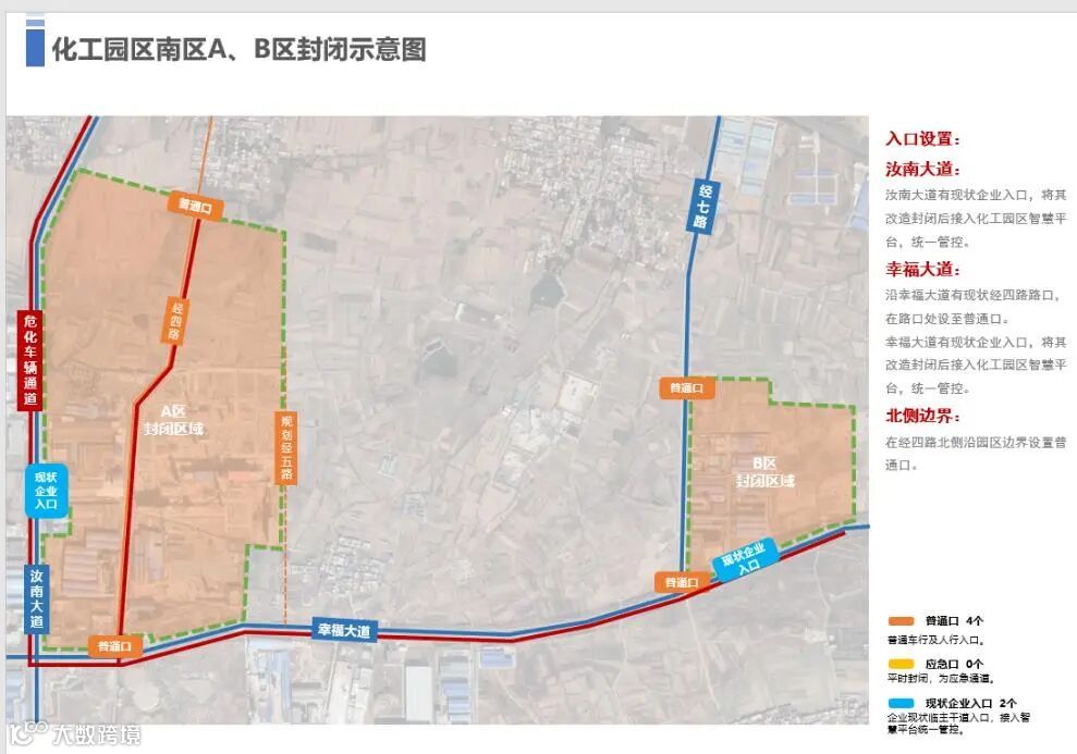 化工园区南区(先期封闭)A区:南至幸福大道,西至汝南大道,东至规划经五路,北至规划化工园区边界;
