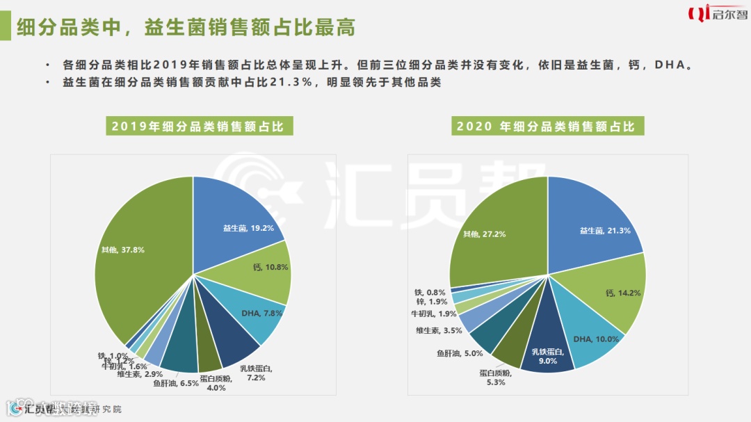●各细分品类相比2019年销售额占比总体呈现上升。但前三位细分品类并没有变化,依旧是益生菌,钙,DHA。