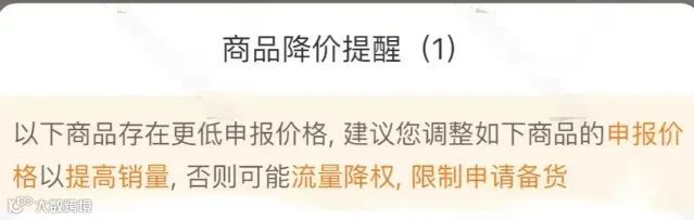从卖家朋友公开的截图中可以看出,其店铺所售的产品被平台检测到价格偏高,后台一直弹出“商品降价提醒”,要求他们在核价通过的基础上再降价,否则可能会影响流量降权导致单量变少,从而限制申请备货。