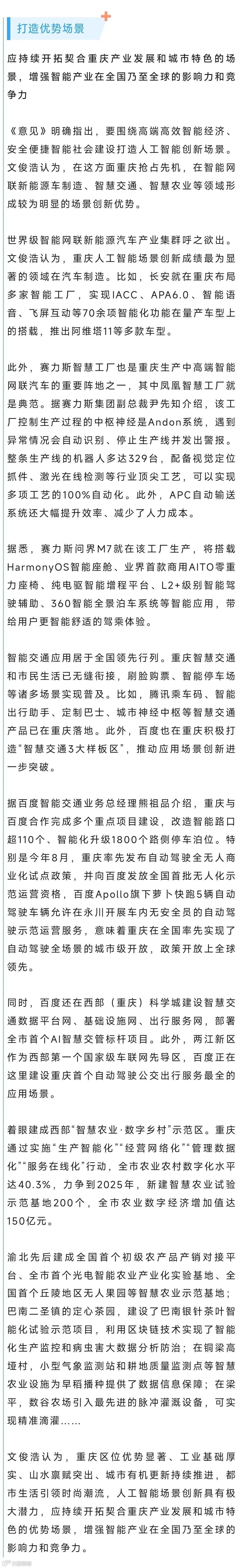 《意见》明确,场景创新已成为人工智能技术升级、产业增长的新路径。这对正着力建设国家新一代人工智能创新发展试验区、力争年内进入全国人工智能技术创新和产业发展第一方阵的重庆而言,利好多多、机不可失。