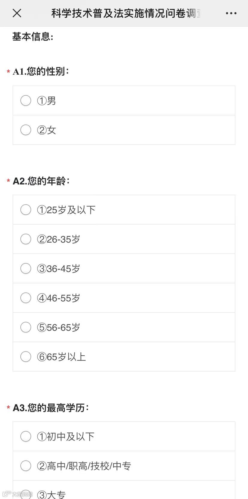 您好!全国人大常委会正在对2002年颁布的《中华人民共和国科学技术普及法》(以下简称《科普法》)的实施情况开展执法检查。为了解社会公众对《科普法》及科普事业发展的认识与看法,现进行专题调查,请您对问卷中的问题认真填答,您的意见将有助于推动国家科普法治完善和科普事业高质量发展。