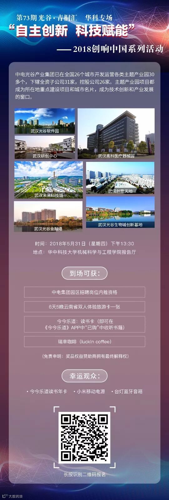 围绕国家战略发展需求,结合“一带一路”、京津冀协同发展、长江经济带发展、粤港澳大湾区等主题,着力推进创新发展重点领域,结合科技成果转化、创新人才培养、基金项目对接等主线。在全国120个双创示范基地开展,搭建创新发展载体平台,形成一批创新成果向全国推广。由武汉市科技局、东湖高新区管委会主办,OVU创客星承办的第73期光谷·青桐汇“自主创新·科技赋能”——2018创响中国系列活动将于5月31日在华中科技大学机械科学与工程学院报告厅举行。本场活动将围绕高校科技成果转化等相关问题,特设嘉宾分享和主题论坛环节,邀请高校、技术转移机构、企业代表,共同探讨高校科技成果转化模式与经验,并开展项目展示、项目路演和对接活动,以期更好的服务高校创新创业群体,促进高校科技成果转化。