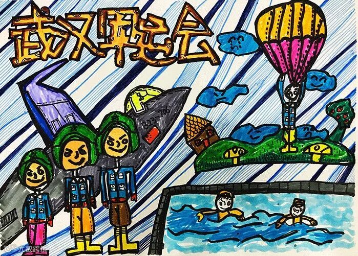 席勒曾说:“只有美的交流,才能使社会团结”。孩子们笔下的吉祥物兵兵、世界各地军人在赛场上的拼搏英姿、武汉特色建筑(如黄鹤楼、龟山、电视塔)等,都是孩子们凭着自己对军运会场面的直观感受和主观想象创作出来的。