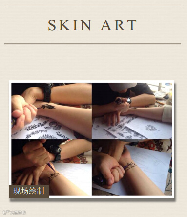 采用纯植物颜料,无毒无痛。以手绘形式,将图案绘制于手足四肢上作为短期装饰,用艺术的形式自我激励与展现自我的生活态度,改变生活的方式。