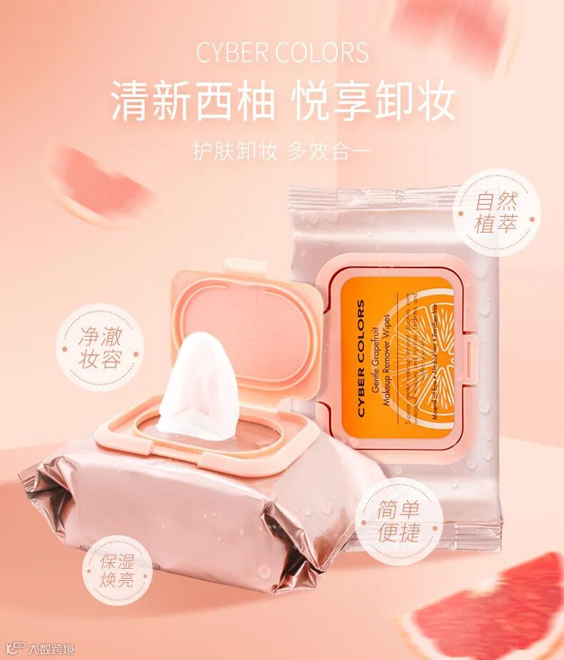 cyber colors西柚卸妆湿巾,除了主打的植萃成分外还富含维C,不含矿物油等较刺激配方。精选的膜布能承载着足量的卸妆液,一张即可卸全脸。