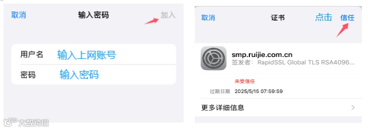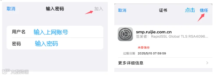 连接步骤:连接信号自动弹出登录页面,输入用户名及密码认证上网,如弹不出认证页面,需手动打开任意浏览器输入1.2.3.4跳转认证;