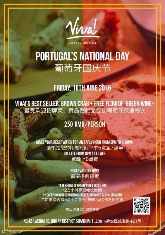 威海路のポルトガル料理店「Viva!」が6月10日、ポルトガルのナショナル・デーを祝う特別セットを提供する。BROWN CRAB(ヨーロッパイチョウガニ)とグリーンワインの2時間半飲み放題がセットで1人250元。事前予約が必要で、夕方5時から夜7時半までと、夜8時以降の2部制で行う。夕方5時からの部は2割引きとする。パーティー気分で出かけてみよう。