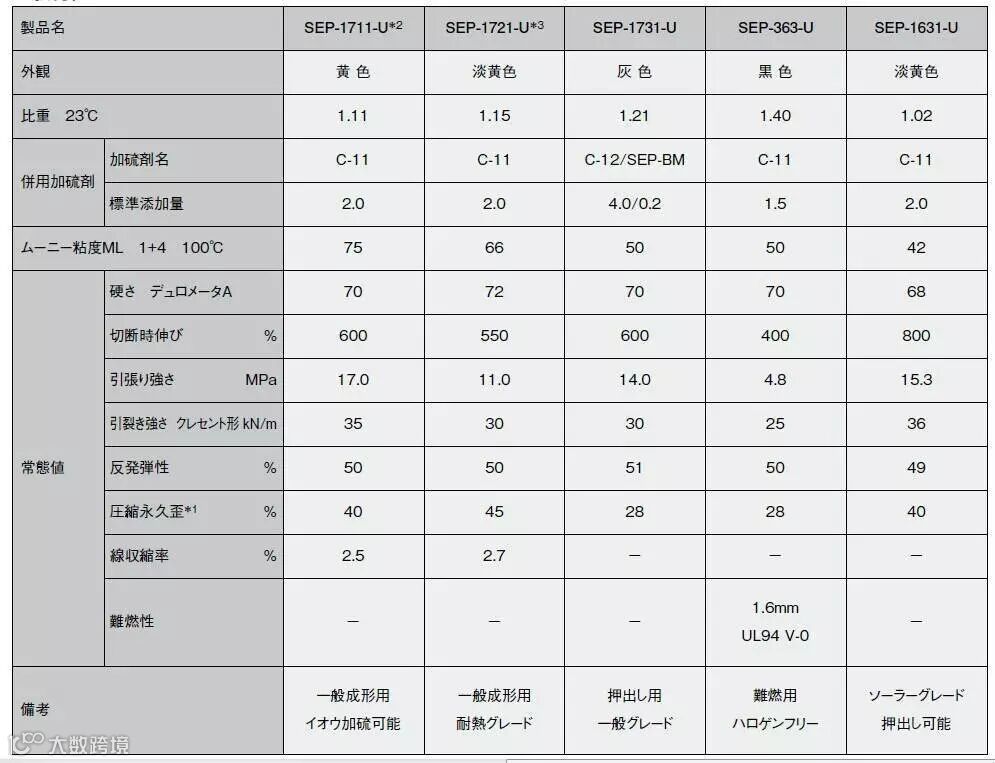 在SEP橡胶中,有普通级(SEP-1711-U,SEP-1411-U),耐热级(SEP-1721-U,SEP-1421-U,SEP-855B-U),挤出级(SEP-1731-U),阻燃级(SEP-363-U),日光级(SEP-1631-U)等品种。