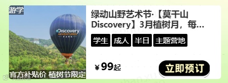 【浇个朋友植树节】1日莫干山Discovery门票+小树苗+创意绘画+绿动之旅纪念胸章+公益贴纸|可加购其他户外探险项目,攀岩、高空网阵和热气球(以当天实际天气情况为准)等。