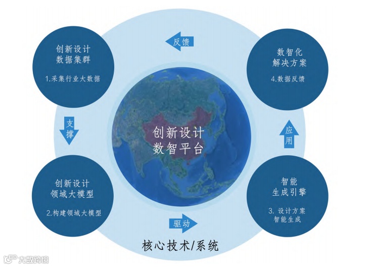 展望数字经济时代的未来,创新设计对实施创新驱动发展战略 , 实现从制造大国向创造大国的跨越,建设创新型国家意义重大。而 AIGC 技术的快速发展为创新设计提供了新鲜的血液和路径—新一代创新设计数智平台(图 七)。AIGC 技术依托其庞大的学习数据量和持续创新的基础大模型,为新一代创新设计数智平台的发展和架构提供了有力支持。平台以大数据、大模型、大知识、大用户为特点,赋能创新设计新场景。