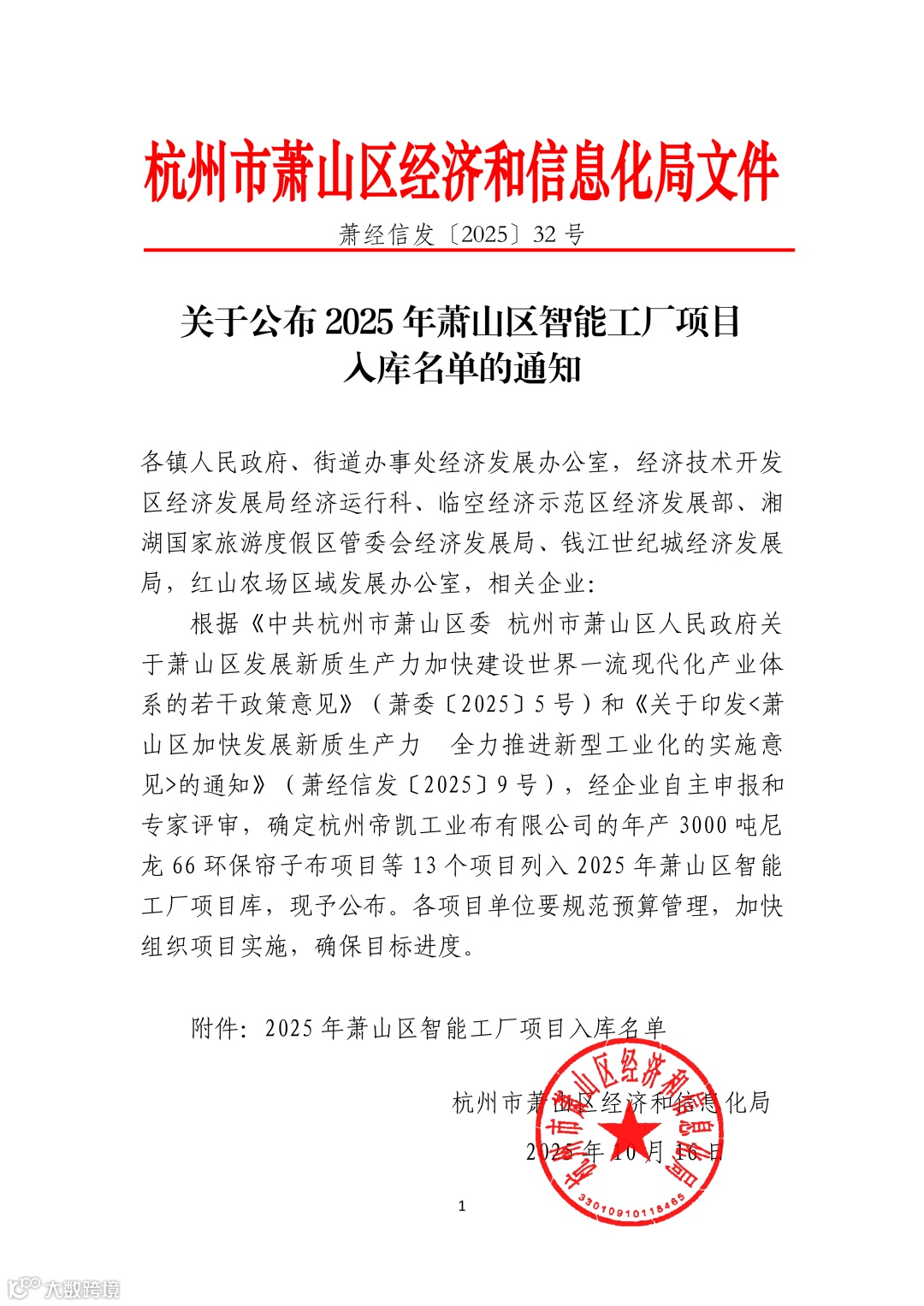 根据《中共杭州市萧山区委 杭州市萧山区人民政府关于萧山区发展新质生产力加快建设世界一流现代化产业体系的若干政策意见》(萧委〔2025〕5号)和《关于印发<萧山区加快发展新质生产力 全力推进新型工业化的实施意见>的通知》(萧经信发〔2025〕9号),经企业自主申报和专家评审,确定杭州帝凯工业布有限公司的年产3000吨尼龙66环保帘子布项目等13个项目列入2025年萧山区智能工厂项目库,现予公布。各项目单位要规范预算管理,加快组织项目实施,确保目标进度。