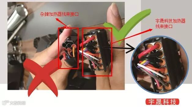 杂牌的加热器,线束直接用黑色胶带缠绕,在机器运行中,导线之间容易黏连发生故障。而宇晟科技的加热器线束外皮采用橡胶管套,不容易造成导线黏连。