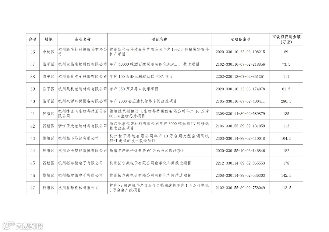 根据《中共杭州市委 杭州市人民政府关于实施“新制造业计划”推进高质量发展的若干意见》(市委﹝2019﹞17号)和《杭州市人民政府办公厅转发市经信局关于杭州市制造业企业技术改造资金补助实施细则的通知》(杭政办函﹝2019﹞46号),经企业自主申报、区县初审推荐、第三方审计机构审计、市级有关部门会商、市经信局党组会审议等程序,杭州水表有限公司年产80万台NB-IoT物联网水表智能制造技术改造项目等52个项目符合政策补助条件。