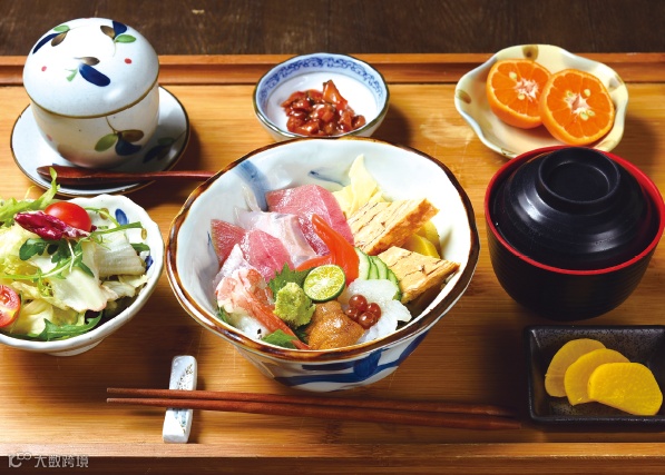 この日ランチに選んだ海鮮丼定食には、昨日届いたばかりの白身魚をはじめ、こだわりの鮮魚がたくさん。小鉢や茶碗蒸しにサラダなども付いて大満足の内容だ。人気のカキフライ定食は55元、ランチメニューのほとんどは100元以内と良心的価格なのも良い。