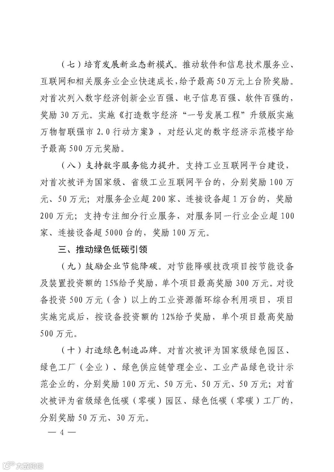 (七)培育发展新业态新模式。推动软件和信息技术服务业、互联网和相关服务业企业快速成长,给予最高50万元上台阶奖励。对首次列入数字经济创新企业百强、电子信息百强、软件百强的,奖励30万元。实施《打造数字经济“一号发展工程”升级版实施万物智联强市2.0行动方案》,对经认定的数字经济示范楼宇给予最高500万元奖励。