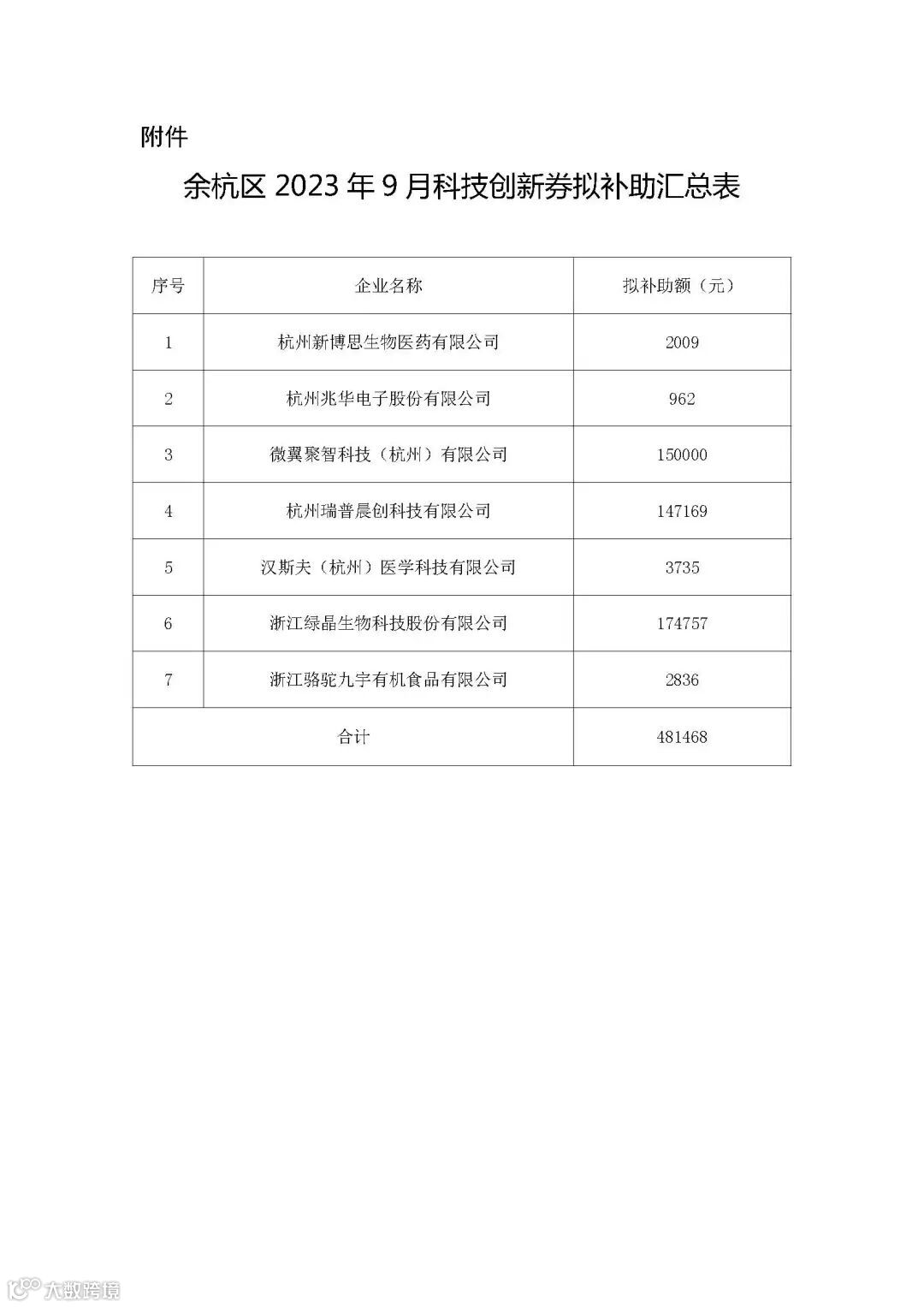 根据《余杭区鼓励科技创新、支撑高质量发展财政扶持政策实施细则(项目补助类)》(余科〔2022〕17号)等文件精神,经事务所审计、区科技局与区财政局复核,拟下达杭州新博思生物医药有限公司等7家企业科技创新券补助资金481468元(详见附件),现按要求予以公示。公示期从2023年11月23日至2023年11月29日。公示期内,如有异议,可通过来信、来电、来访等形式反映。单位反映问题的,须加盖公章;个人反映问题的,须署真实姓名和联系电话。为保证异议处理的客观、公正,匿名异议将不予受理。